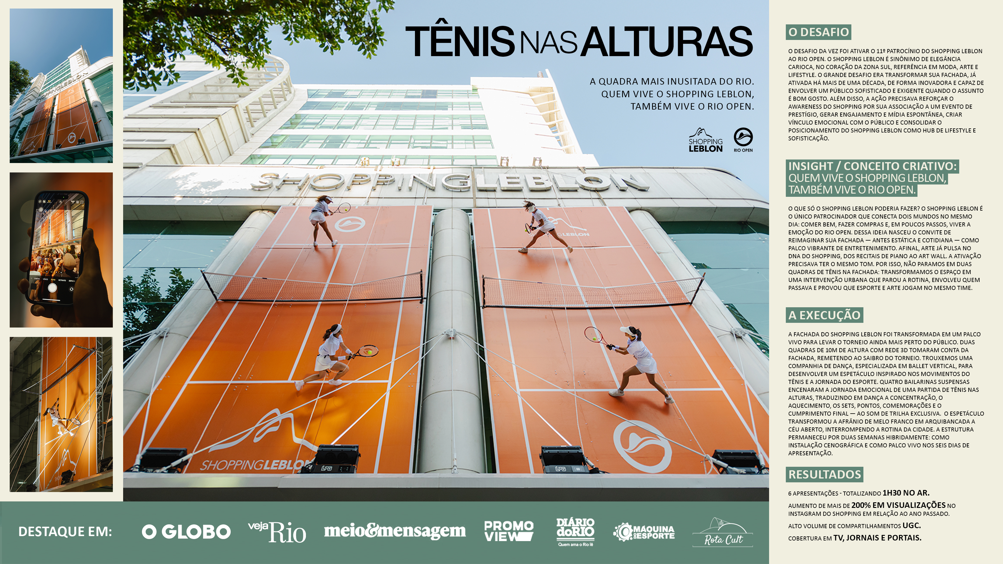 A fachada do Shopping Leblon se transformou em quadras de tênis para o Rio Open 2025, criando um espetáculo inédito. Durante três dias de apresentações, bailarinas suspensas encenaram uma partida aérea, unindo arte e esporte de forma inovadora.