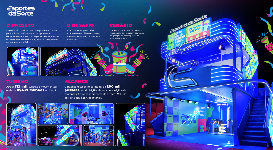 A ativação da Esportes da Sorte no Fortal foi um stand de experiência focado em engajamento e visibilidade da marca. O espaço funcionava em dois ambientes integrados: no térreo, o Dance Space, com DJ, pista interativa através de fones iluminados; no primeiro andar, o Espaço de Customização, com personalização de bucket hats e cordões para celular.
